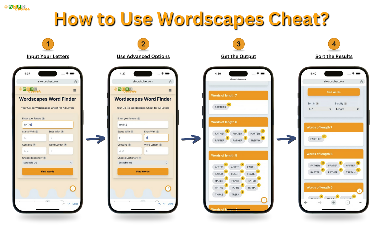 The Wordscapes Cheat tool provides an option where you can format the word results in a properly organized order – by points or scores.